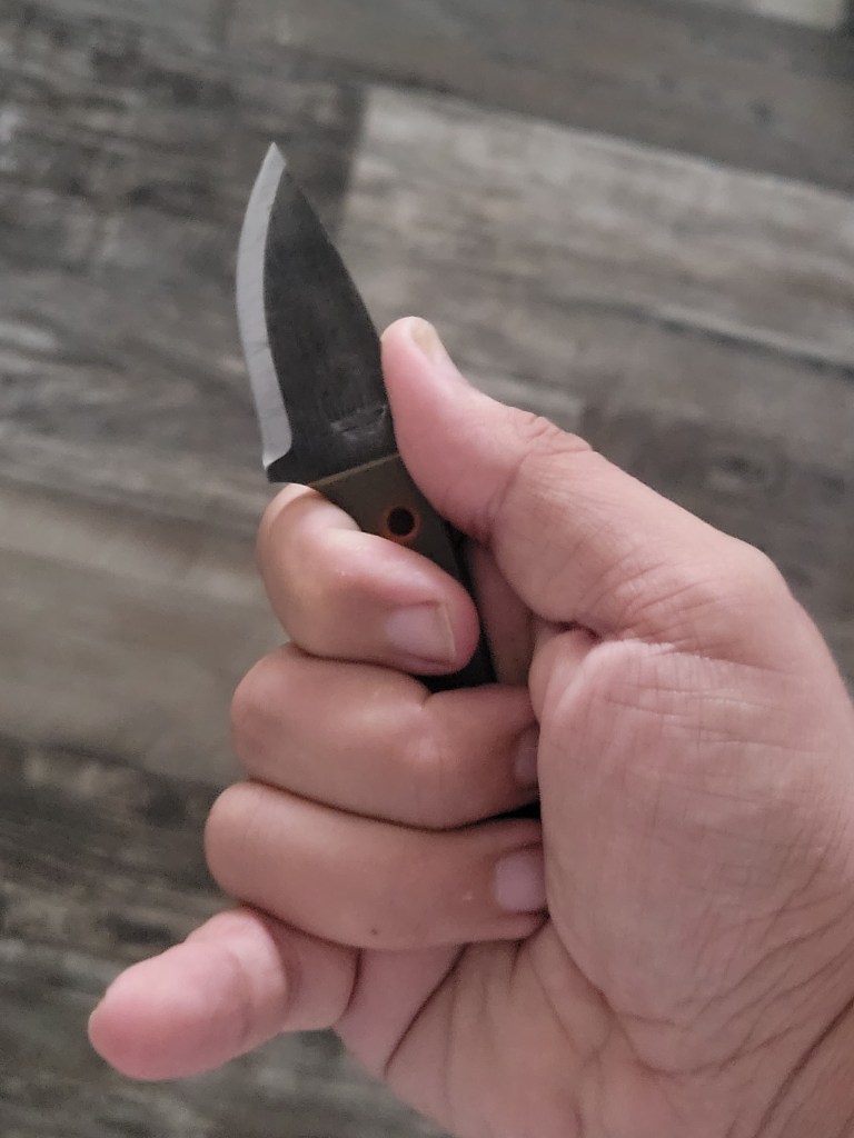 In hand, this has a solid three-finger grip and plenty of room on the spine to place my thumb when bearing down on the blade for push cuts. The Knife is comfortable with some prolonged use, but keep in mind it is a neck knife and will definitely produce more hand fatigue than something with a larger handle.