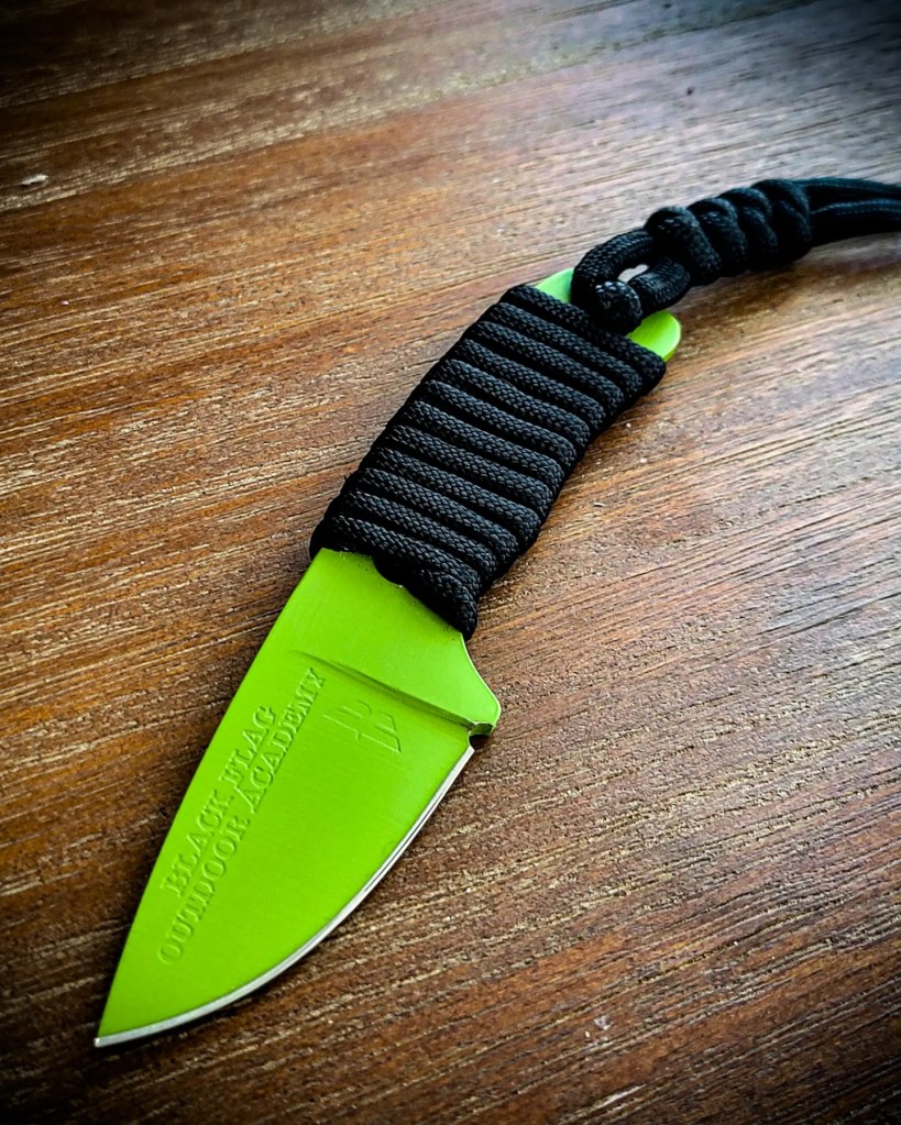 The Wicket is one of the most popular models Knives by Nuge currently makes, and for very good reason; this small fixed blade has proven to be a versatile companion for everyday carry, hiking, and as a backup to a larger fixed blade. Coming in at 5 inches overall with a 2.25-inch blade, the Wicket is easy to carry and won’t slow you down. The Black Flag Outddor Academy version of the Wicket features a full flat grind 1095 or Nitro-V steel blade that is cerakoted neon green for visibility and corrosion protection. The handle is black paracord wrapped for a comfortable grip which is also great in a pinch for emergency cordage. The sheath is neon green kydex and is set up for neck carry, but can be easily adapted for scout or clip carry. The Wicket is a daily driver for me, I carry it around the house, into town, and into the woods. The full flat grind makes it an exceptional slicer making it ideal for opening boxes, cutting through plant materials in foraging tasks, gutting small game, and even some light tinder processing.