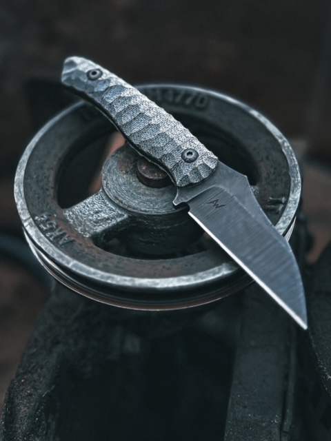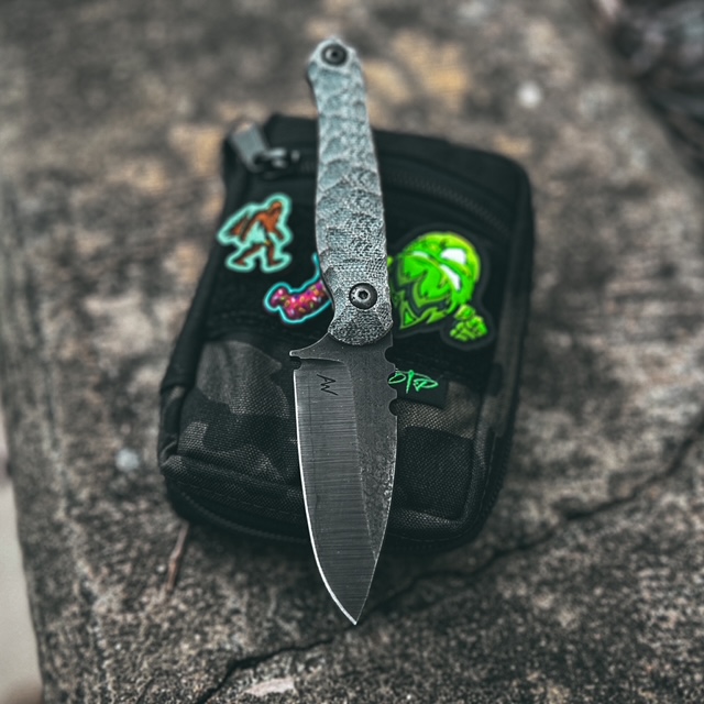 The Eddy2, while similar to the KLIFF but also very different, has a drop point style black oxide coated 2.78” 80CrV blade. The overall length with the textured Micarta handles is 6.95” making the Eddy2 another great EDC option. The Eddy2 will handle your normal everyday cutting tasks but can take on a lot more. If you need a work companion that you can count on the Eddy2 is your knife. While I haven’t tested it to see if I can make fire with it, it has handled itself while at work by helping me cut holes in sheet metal and sheetrock or cutting and stripping wires, and the heat treatment that Alex puts on these helps them both hold up beautifully with keeping that edge sharp.