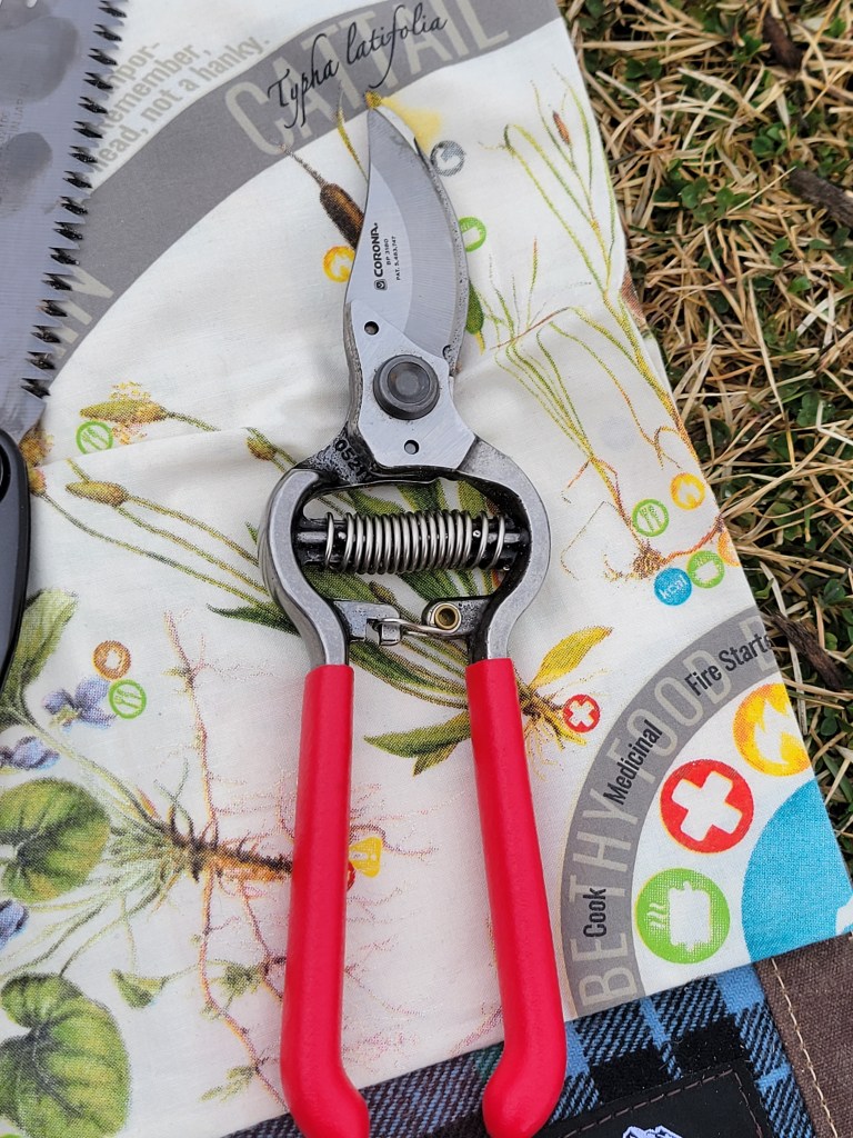 Pruning shears are a traditional tool in the garden but are also incredibly valuable in foraging. Some plant stems are thick and tree even a thin tree branch can be a challenge for a knife to cut through cleanly. Using a high-quality pruning shear not only makes our life easier, it also reduces damage to a tree or woody shrub when having to harvest part of the plant. I use Corona forged steel bypass pruners, they are well made, tough, and reliable with a great price point.