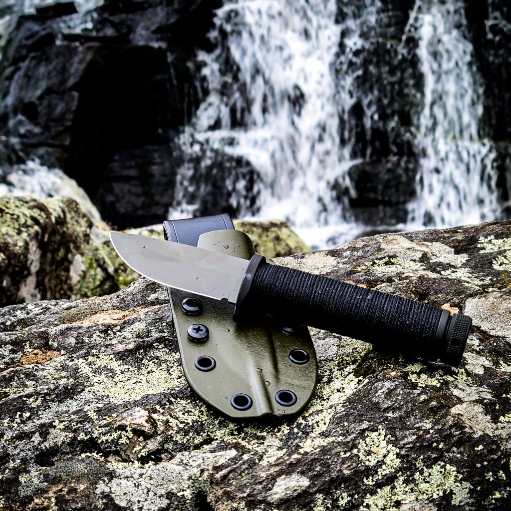 Like always, let’s start with some specs. The P.A.C.K. Lite weighs in at 3.2 ounces, making it ideal for EDC, lightweight hiking, or as part of a light emergency kit. The overall length is 7 inches with a 3 inch CPM-154 blade. There is a blade guard that will help protect your fingers without getting in your way. The handle is made from high grade Aluminum and wrapped in cord for super positive grip. The butt cap is removable and has a compass on it, and you can store assorted survival gear inside. The whole knife is coated in a durable gunkote for a nice non-reflective matte finish. The sheath is a nice fitting OD Green kydex with a drainage hole and accepts a number of optional accessories, including a leather belt loop and some additional storage options.
