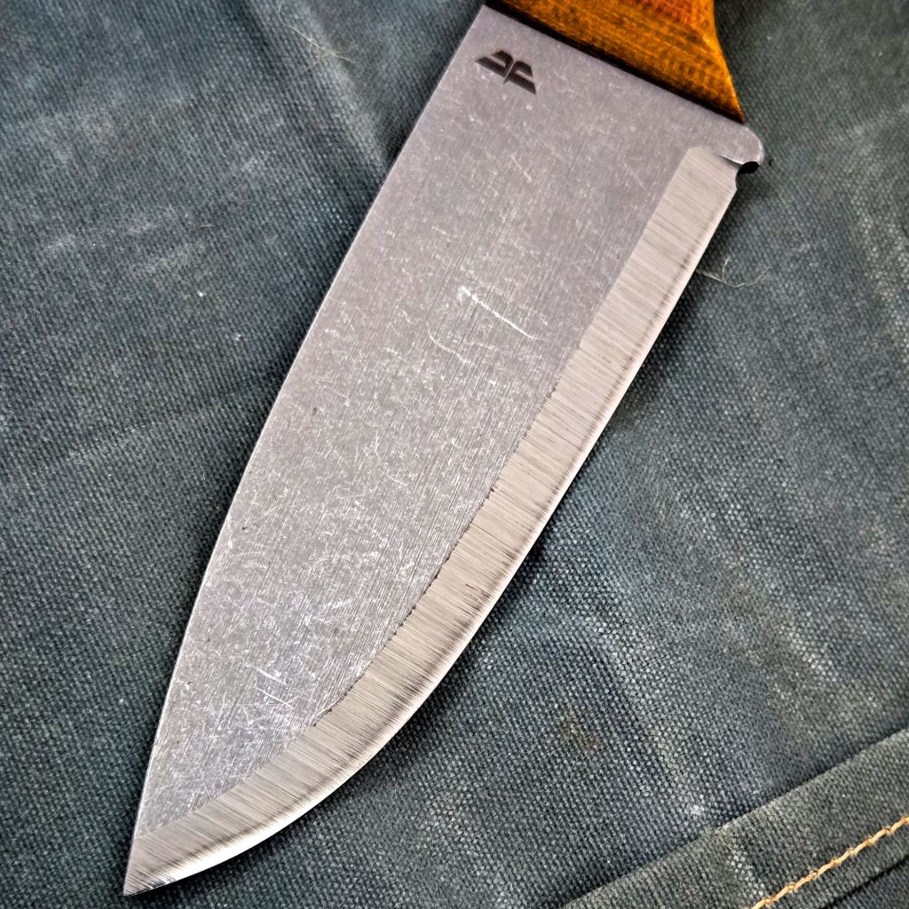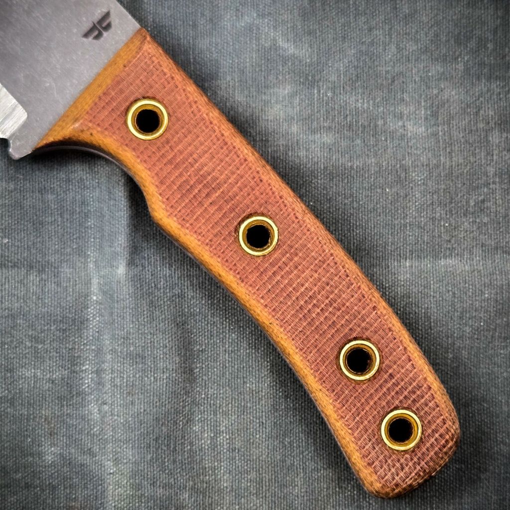 There are plans to make Nitro-V versions in a high saber grind in the future. The handle slabs are ¼ inch micarta slabs with flared brass tubes. My prototype came with a custom made Nuge-Dex (kydex) sheath, there are plans for a leather belt sheath with dangler made by Badger Claw Outfitters in the future.
