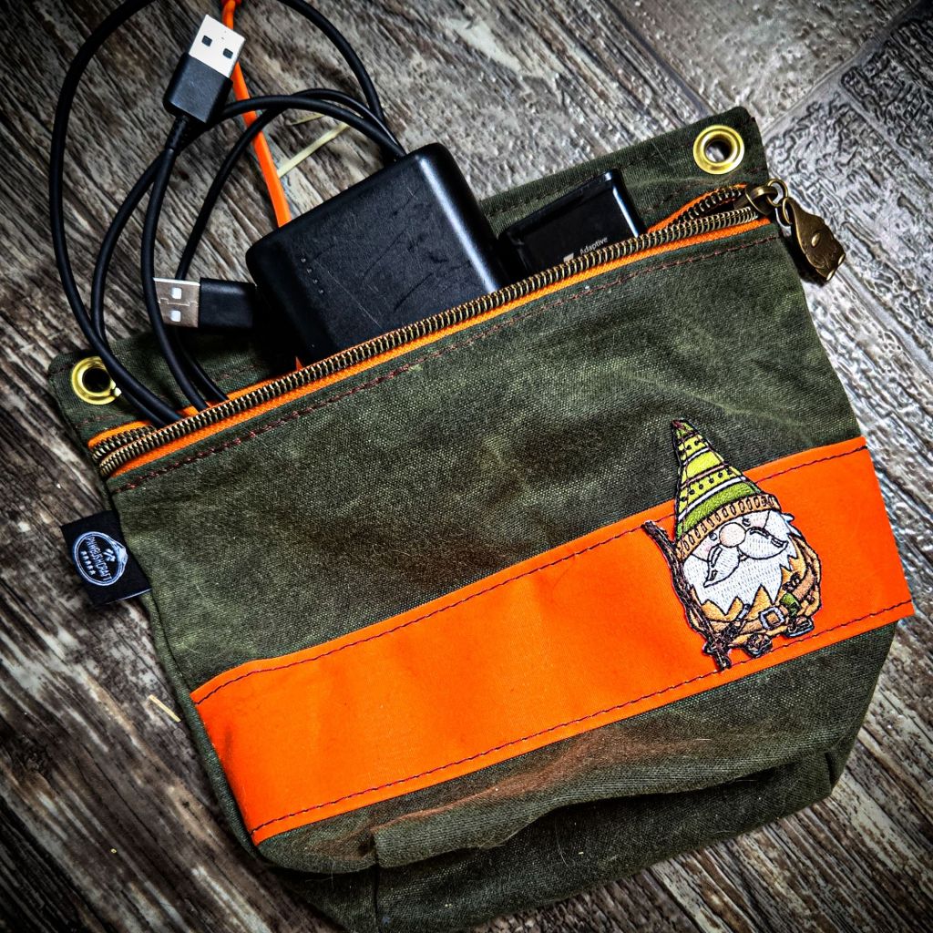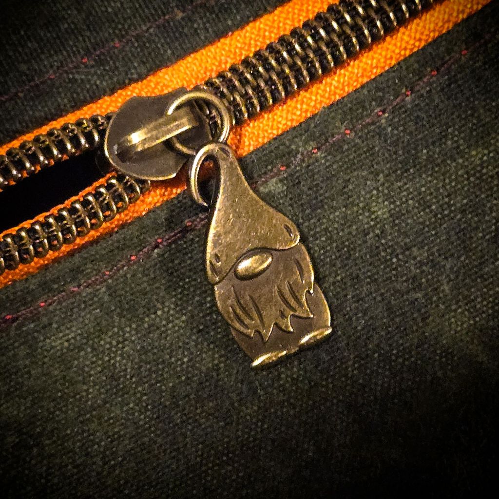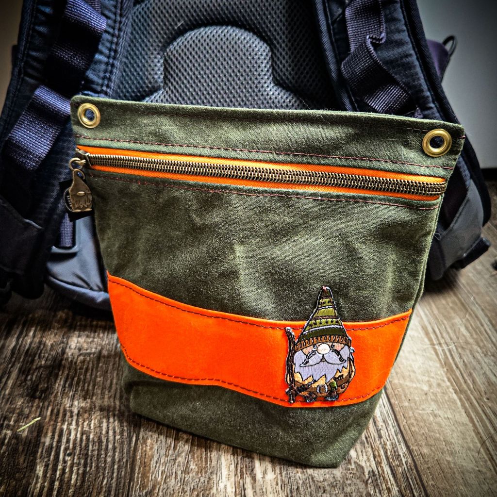 The Gnome Pouch is made from 10.1 ounce waxed canvas; this stuff is tough and resistant to the elements, making it ideal for outdoor use. Like all quality waxed canvas it will patina over time giving it character and providing you a fond reminder of all your adventures. The zipper is a high quality zippers that will hold up to heavy use with a fun little gnome zipper pull to match the theme. Above the zipper on the far left and right sides are two brass eyelets. The pouch itself is 9X7.5 inches with a wide 6×3 inch bottom. Everything on these pouches is hand cut and assembled, so there may be some slight size variation between batches. One of the greatest things about PNWBUSHCRAFT products is that they are designed to look as good as they function and Heather has an eye for the small details! My Gnome Pouch has an orange stripe with a matching orange backed zipper that really pulls the whole package together nicely. You can expect to see different color combinations and variations, giving each pouch a unique and personalized look!